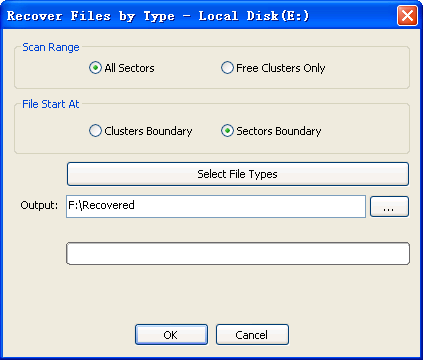 File Start At: Output: Select output folder. All recovered files will immediately output to this folder. Select File Types: Open a dialog box for selecting file types to recover. The dialog is shown as the following: